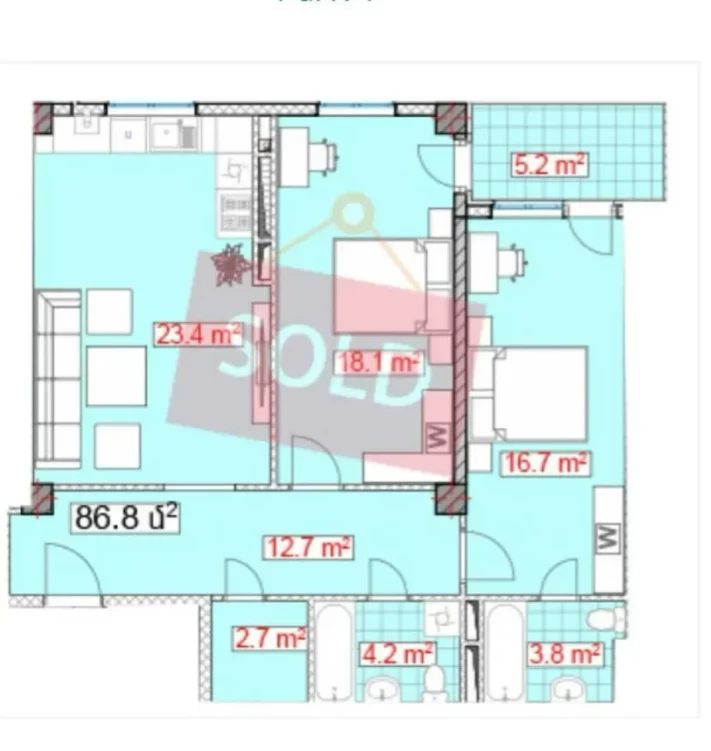 It has 2 rooms, 2 bathrooms, 2 balconies (the large balcony can be converted into a room if desired) and a basement.